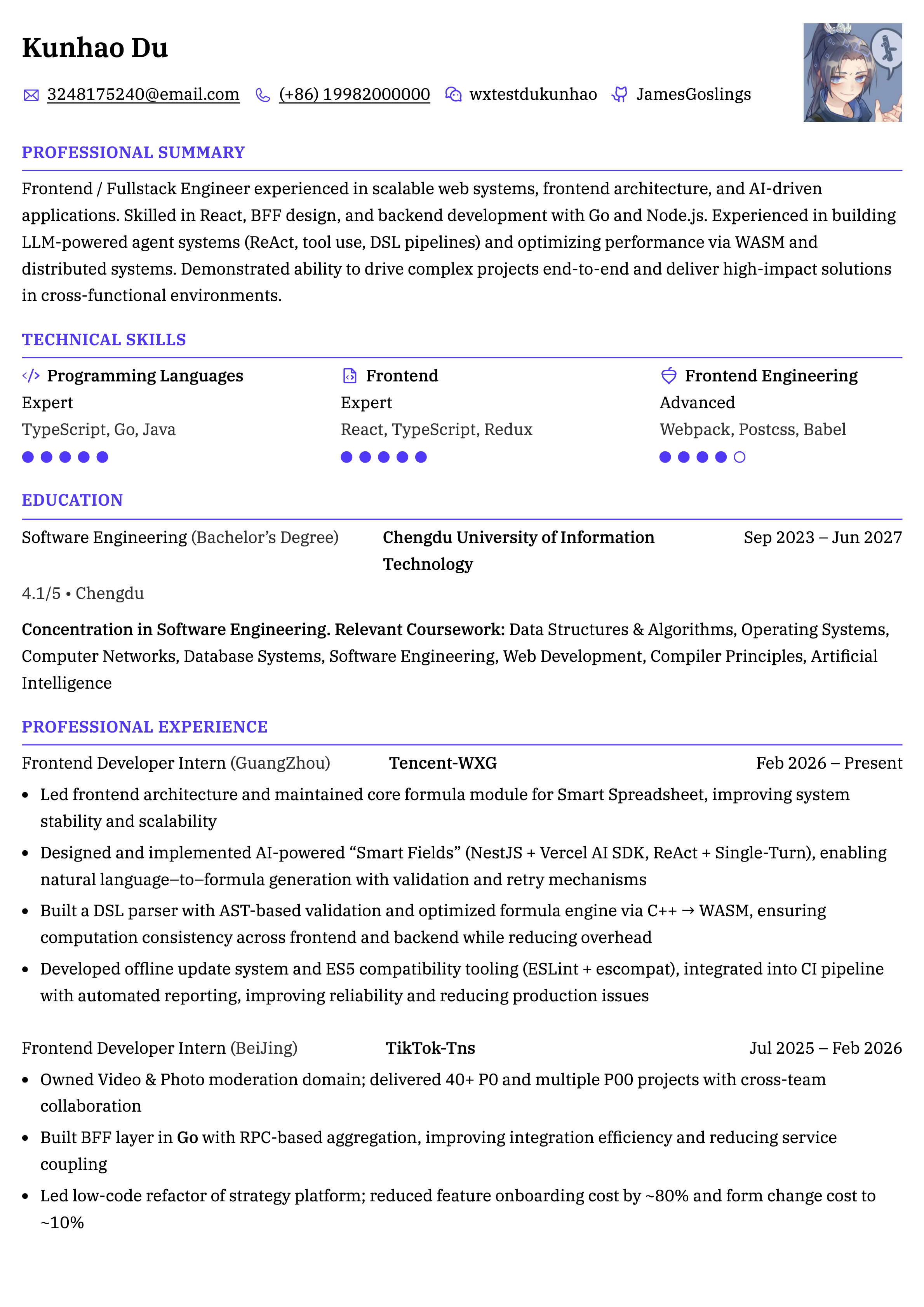 "Wow, what an impressive profile! You are very talented. I'm also a fellow SWE on the job hunt and I came across a linked to Reactive Resume on Reddit and gave it a shot. This could easily be a paid product. Very clean and useful."